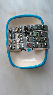 Materials: 925 Silver with faceted multi colored tourmaline stones. Cuff. Fits up to 8” wrists.