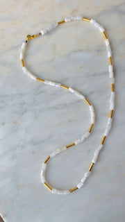 Materials: 24kt gold plated details. Approx 38" long. Lobster closure. Can be worm as a double necklace. Semiprecious stones. One of a kind.