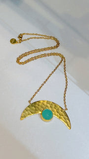 Mayerials: 22kt gold plated bronze. Approx 20" long. Faceted minty green chalcedony stone.